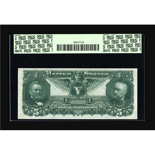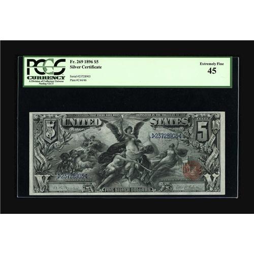 <B>Fr. 269 $5 1896 Silver Certificate PCGS Extremely Fine 45.</B></I> A beautifully margined example of what is considered by many collectors to be the pinnacle of the engraver's art. This note has all the eye appeal of a five-figure Choice New example, and would slip, visually, into a set of Uncirculated notes.<BR><BR><b>Shipping:</b> Coin/Currency (<a target="_blank" href="http://www.heritageauctions.com/common/shipping.php">view shipping information</a>)