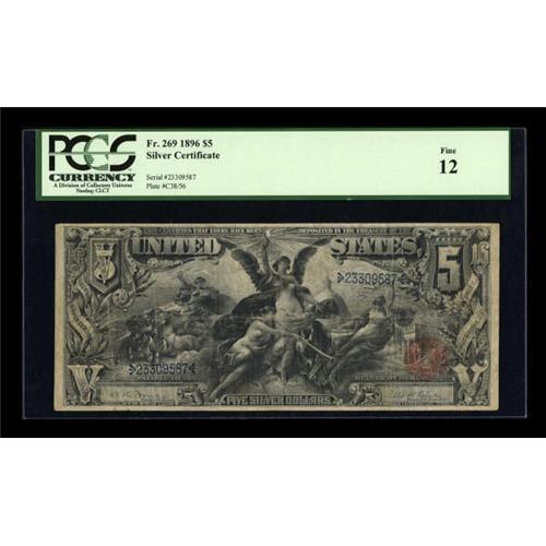 <B>Fr. 269 $5 1896 Silver Certificate PCGS Fine 12.</B></I> The usual handling is noticed on this pleasing $5 Ed that is nicely margined.<BR><I>From The Kansas City Collection.</B></I><BR><BR><b>Shipping:</b> Coins & Currency (<a target="_blank" href="http://www.heritageauctions.com/common/shipping.php">view shipping information</a>)