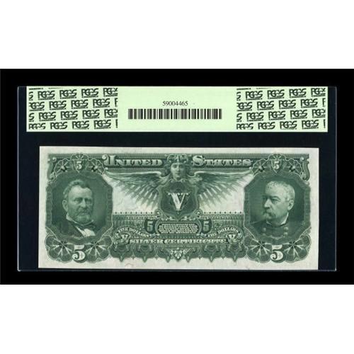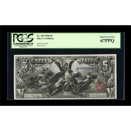 <B>Fr. 269 $5 1896 Silver Certificate PCGS Superb Gem New 67PPQ.</B></I> PCGS has not, as of yet, released their population figures, but it is certainly a safe presumption that this piece is alone or very nearly alone at this grade level. PMG has graded just a single 67 out of over seventy Fr. 269s submitted. This piece is everything you would expect from the grade--beautifully margined, brightly colored and originally embossed. The popularity of this type is unquestioned and in its PCGS holder, its grade will not be questioned either. An extraordinary example of an ultimately popular piece.<BR><BR><b>Shipping:</b> Coins & Currency (<a target="_blank" href="http://www.heritageauctions.com/common/shipping.php">view shipping information</a>)