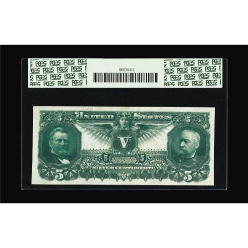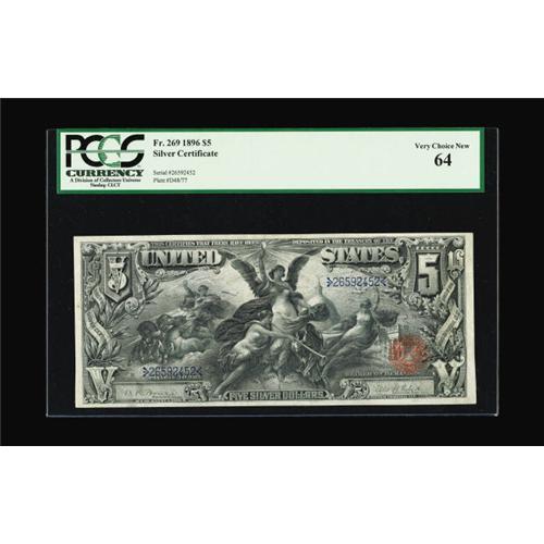 <B>Fr. 269 $5 1896 Silver Certificate PCGS Very Choice New 64.</B></I> The color of this note enhances the artwork displayed. Truly a masterpiece of the engraver's craft, it embodies the ideals our great nation held back then. A small, unobtrusive spot in the left margin affects nothing. There are simply not enough of these to go around. Expect this beauty to hammer in the area of...