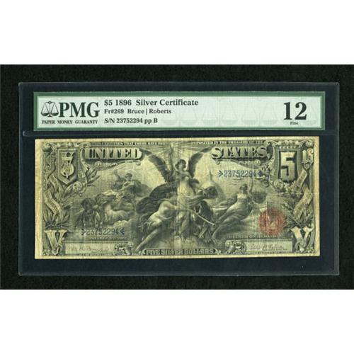 <B>Fr. 269 $5 1896 Silver Certificate PMG Fine 12.</B></I> A solid piece with all the look of a boldly detailed Very Fine. The margins are also full.<BR><BR><b>Shipping:</b> Coins & Currency (<a target="_blank" href="http://www.heritageauctions.com/common/shipping.php">view shipping information</a>)