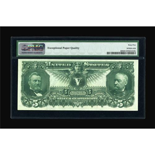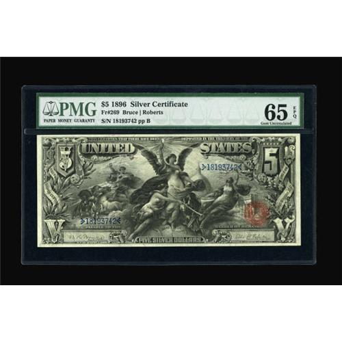 <B>Fr. 269 $5 1896 Silver Certificate PMG Gem Uncirculated 65 EPQ.</B></I> Beautifully well margined with super color, original paper surfaces, and razor-sharp print quality. The extremely busy design of these Five Dollar Educationals created a situation where the central portion of the note frequently has a somewhat muddy appearance. This one is inked just right and has terrific clarity of all the features of the allegorical design. A very handsome piece that looks as though it would have been as equally at home in a 66 holder. <BR><I>From The Warren Marshall Collection</B></I><BR><BR><b>Shipping:</b> Coins & Currency (<a target="_blank" href="http://www.heritageauctions.com/common/shipping.php">view shipping information</a>)