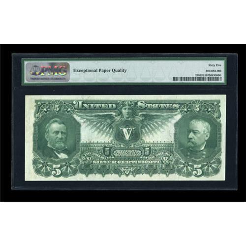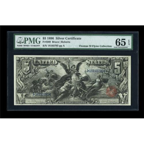 <B>Fr. 269 $5 1896 Silver Certificate PMG Gem Uncirculated 65 EPQ.</B></I> While not truly rare at this grade level, Five Dollar Educationals are immensely popular, and there will never be enough 63-and-higher pieces to supply collectors' demands for exceptional examples. This note, with its Exceptional Paper Quality designation, appears to us to be at the upper edge of the 65EPQ grade. It certainly would have been at home in a 66E holder if not a 67. A wonderful piece of paper.<BR><I>From The Thomas M. Flynn Collection</B></I><BR><BR><b>Shipping:</b> Coins & Currency (<a target="_blank" href="http://www.heritageauctions.com/common/shipping.php">view shipping information</a>)