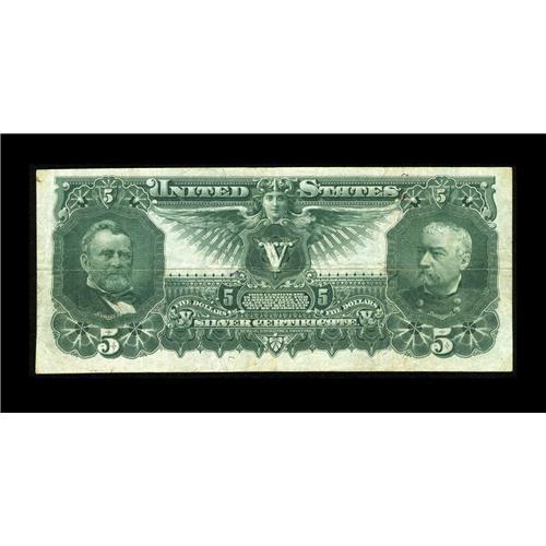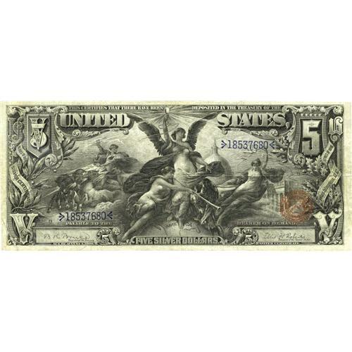 <B>Fr. 269 $5 1896 Silver Certificate Very Fine.</B></I> Mid-grade examples with any substance seem to have disappeared from the marketplace. This piece which is wholly original save for a bit of restoration in the left margin is as nice a mid-grade example as is available at most shows or in dealer inventories.<BR><I>From The Plymouth Rock Collection</B></I>