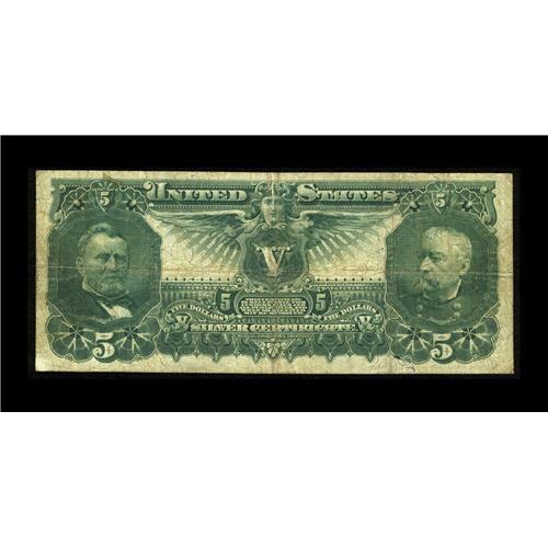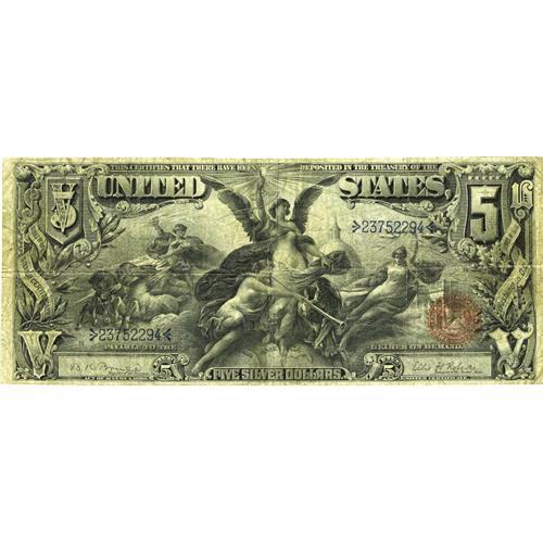 <B>Fr. 269 $5 1896 Silver Certificate Very Good-Fine.</B></I> This note would appear in most dealer cases as full Fine. There is a bit too much wear to warrant the full grade, but we must note that this piece is completely devoid of problems of any kind.<BR><I>From The Plymouth Rock Collection</B></I>