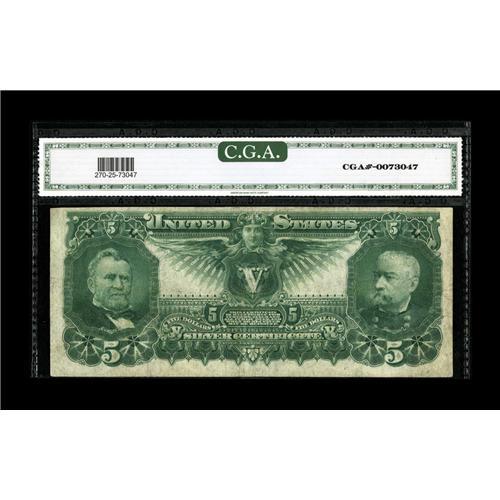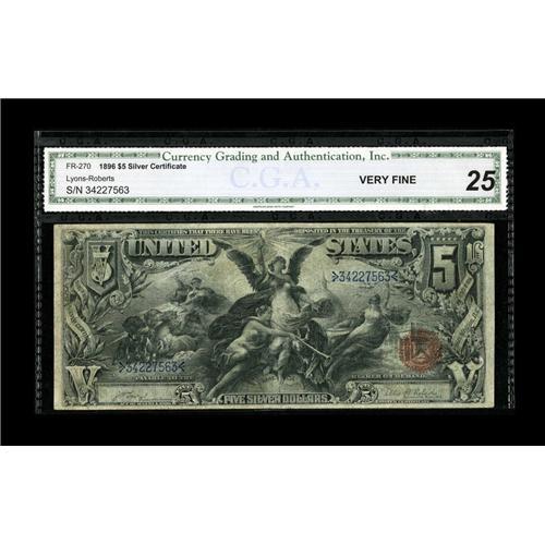 <B>Fr. 270 $5 1896 Silver Certificate CGA Very Fine 25.</B></I> A nice-looking mid-grade circulated Educational Five, and the scarcest of the three Friedberg numbers of this type.<BR><BR><b>Shipping:</b> Coin/Currency (<a target="_blank" href="http://www.heritageauctions.com/common/shipping.php">view shipping information</a>)