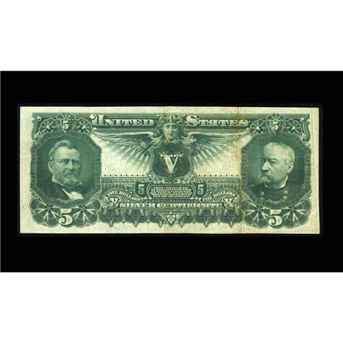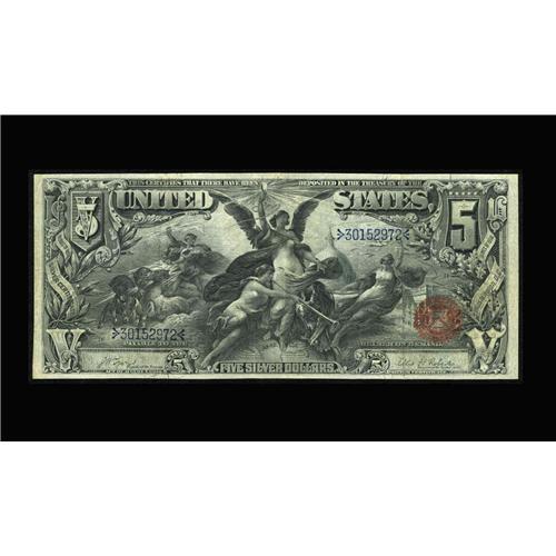 <B>Fr. 270 $5 1896 Silver Certificate Fine-Very Fine.</B></I> A beautifully margined example of the scarcest of the three $5 Educational signature varieties. There is a little counting soil at the right, but the note is primarily clean and problem-free for the grade. At a glance, it gives the visual impression of an XF or better piece. Fr. 270's account for only about 15% of all the known Five Dollar Educationals, and they really should bring a premium in excess of the 20% or so that they currently realize.