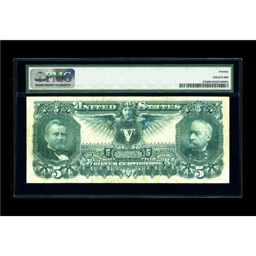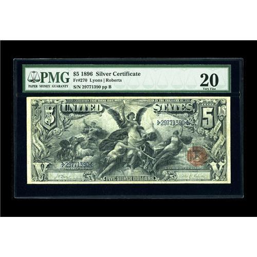<B>Fr. 270 $5 1896 Silver Certificate PMG Very Fine 20.</B></I> Here is an example of the scarcest of the three $5 Ed signature combinations. The note is clean and problem-free for the grade. Fr. 270s account for only about 15% of all the known Five Dollar Educationals, and they should bring a premium in excess of the 20% or so that they currently realize.<BR><I>From The Collection of Daniel Weissman</B></I><BR><BR><b>Shipping:</b> Coin/Currency (<a target="_blank" href="http://www.heritageauctions.com/common/shipping.php">view shipping information</a>)