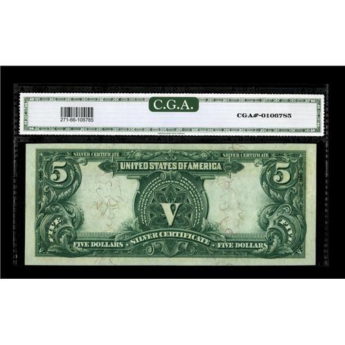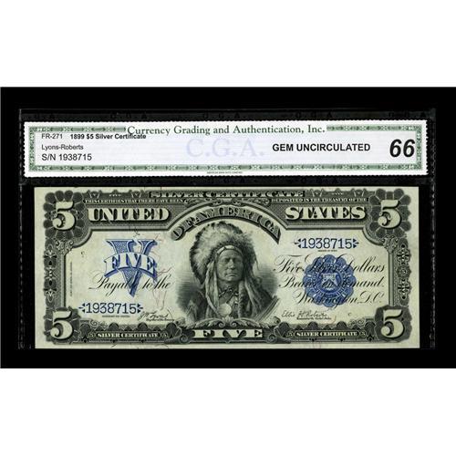 <B>Fr. 271 $5 1899 Silver Certificate CGA Gem Uncirculated 66.</B></I> Sharp corners and ample margins are noted. The bottom margin is especially large for the series.<BR><BR><b>Shipping:</b> Coin/Currency (<a target="_blank" href="http://www.heritageauctions.com/common/shipping.php">view shipping information</a>)