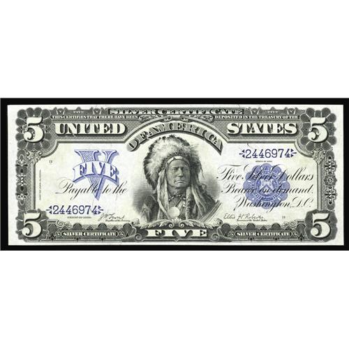 <B>Fr. 271 $5 1899 Silver Certificate Choice New.</B></I> The back centering is a touch low on this otherwise well margined Chief. This bright, colorful note still has some punch on the serial numbers.