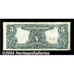 Fr. 271 $5 1899 Silver Certificate Fine-Very Fine. A handsome example of this first Chief signature combination. The margins are broad, the colors are excellent, and the note is problem-free save for the two small stains on the back. <BR><BR><B>Important notice:</B> Heritage usually auctions material at the rate of 200-250 lots per hour. On some occasions eBay Live bid software or the Internet may not be able to keep up with the pace of the auction. We recommend placing a realistic absentee bid now as insurance to avoid disappointment. Occasionally the auctioneer may eliminate or reject an eBay Live bid, and the auctioneer may also reopen a lot after the close of the eBay live bidding (usually because we missed an audience bid), and may reject your bid even if it shows you as the winning bidder. By bidding via eBay Live, you agree that Heritage may award the lot to another bidder at its sole discretion under the circumstances described above or any other reasonable circumstances. Since eBay bids are not shown to us until we open the lot on the floor, we treat those bids just like floor bids. In most cases the floor responds before the eBay bid is presented to us, due to Internet lag time, so for consistency we have made it a policy that floor bids are always considered first over tie eBay live bids. Also please note that all Heritage lots purchased through eBay Live carry a 20% Buyer's Premium. Please make sure you read the Terms and Conditions before you bid. <BR><BR><B>IMPORTANT ANNOUNCEMENT ABOUT RESERVES:</B> Heritage now divulges all reserves on its web site 7 days before every auction. If you want to know whether the reserve on this lot has been met, and if not, what the reserve amount is, please visit this lot page on the HeritageCoin.com web site, or email: bid@HeritageGalleries.com