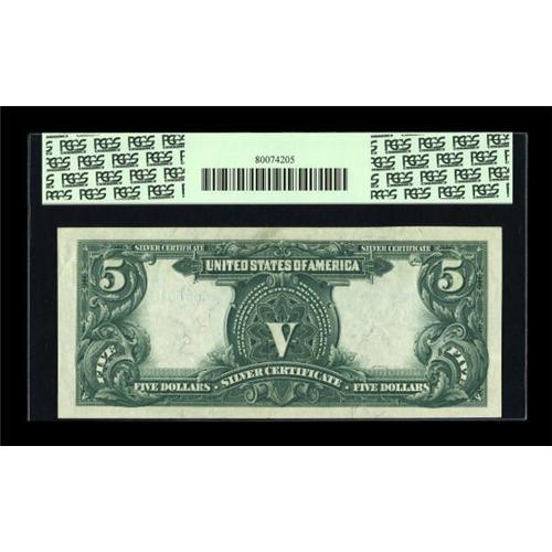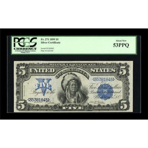<B>Fr. 271 $5 1899 Silver Certificate PCGS About New 53PPQ.</B></I> Plenty of embossing can still be seen on this lightly handled, vividly overprinted Chief.<BR><BR><b>Shipping:</b> Coins & Currency (<a target="_blank" href="http://www.heritageauctions.com/common/shipping.php">view shipping information</a>)