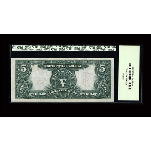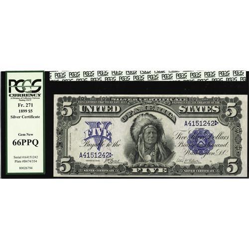 <B>Fr. 271 $5 1899 Silver Certificate PCGS Gem New 66PPQ.</B></I> The regal G.F.C. Smillie portrait of Ta-to-ka-in-yan-ka, also known as Running Antelope, a member of the Oncpapa tribe of Sioux Indians, graces the central obverse of this beloved design. This Gem example exhibits outstanding margins and centering, and the rich colors and bold embossing indicate unquestionable originality.