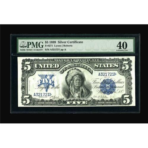 <B>Fr. 271 $5 1899 Silver Certificate PMG Extremely Fine 40.</B></I> A pleasing mid-grade example of this proud Chief design, well margined with plenty of eye appeal.<BR><BR><b>Shipping:</b> Coins & Currency (<a target="_blank" href="http://www.heritageauctions.com/common/shipping.php">view shipping information</a>)