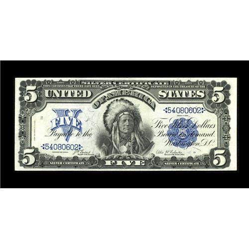 <B>Fr. 271 $5 1899 Silver Certificate Very Fine-Extremely Fine.</B></I> Four folds are clearly seen on this nicely centered Indian $5 that is a trifle flat. This lightly circulated note definitely faces up well.<BR><BR><b>Shipping:</b> Coin/Currency (<a target="_blank" href="http://www.heritageauctions.com/common/shipping.php">view shipping information</a>)
