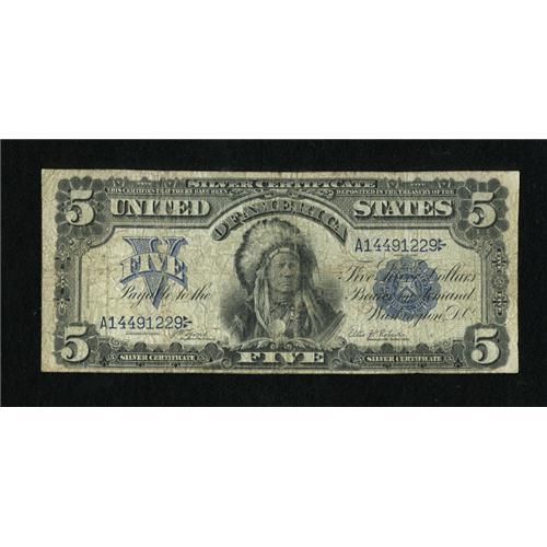 <B>Fr. 271 $5 1899 Silver Certificate Very Good.</B></I> This Chief has some nicks, some holes, but is mostly complete.<BR><BR><b>Shipping:</b> Coins & Currency (<a target="_blank" href="http://www.heritageauctions.com/common/shipping.php">view shipping information</a>)
