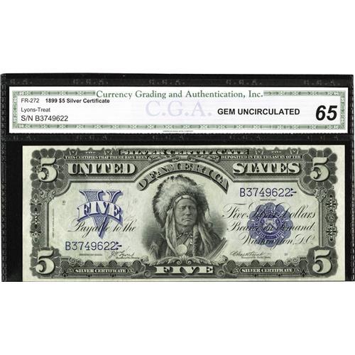 <B>Fr. 272 $5 1899 Silver Certificate CGA Gem Uncirculated 65.</B></I> The margins are perfectly proportioned and evidence of embossing is noted through the holder.