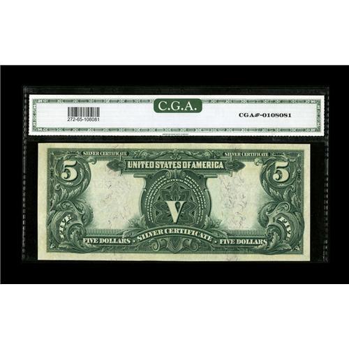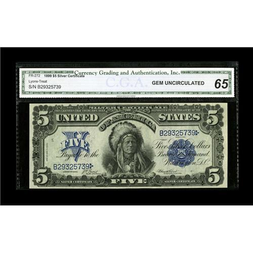 <B>Fr. 272 $5 1899 Silver Certificate CGA Gem Uncirculated 65.</B></I> The margins are perfectly proportioned and evidence of embossing is noted through the holder.<BR><BR><b>Shipping:</b> Coin/Currency (<a target="_blank" href="http://www.heritageauctions.com/common/shipping.php">view shipping information</a>)