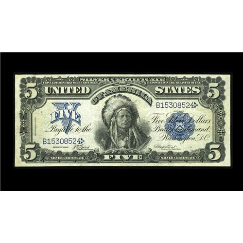 <B>Fr. 272 $5 1899 Silver Certificate Very Fine-Extremely Fine.</B></I> Nice natural surfaces, which include the original embossing, remain on this handsome well margined Chief. It's problem free save for a single, unobtrusive closed pinhole. The note has considerable claim to the full XF grade.<BR><I>From The Ross Bailey Collection</B></I>