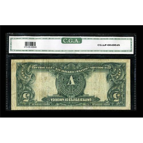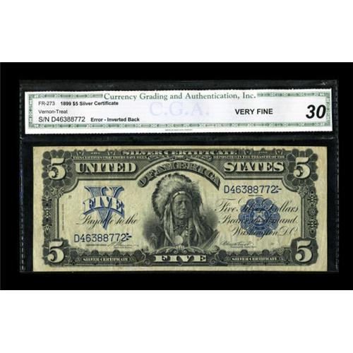 <B>Fr. 273 $5 1899 Silver Certificate CGA Very Fine 30.</B></I> This is only our second offering of this Friedberg number for the error type as inverted Chiefs are not too common. <BR><BR><b>Shipping:</b> Coins & Currency (<a target="_blank" href="http://www.heritageauctions.com/common/shipping.php">view shipping information</a>)