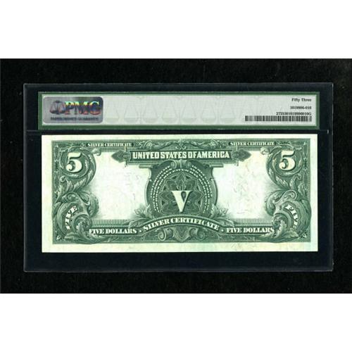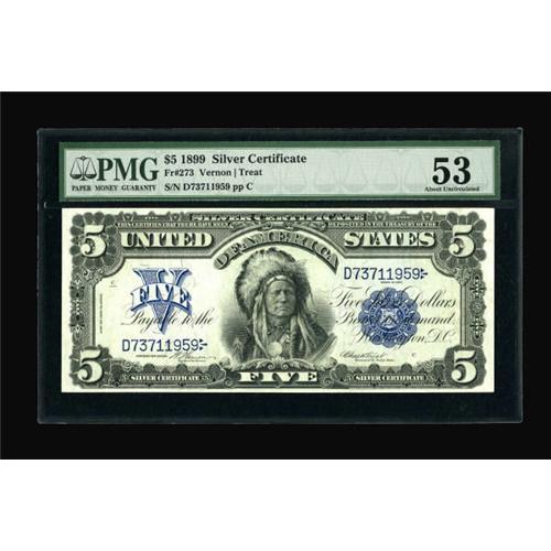 <B>Fr. 273 $5 1899 Silver Certificate PMG About Uncirculated 53.</B></I> A centerfold and some tiny corner tip folds are noted on this well margined issue.<BR><BR><b>Shipping:</b> Coins & Currency (<a target="_blank" href="http://www.heritageauctions.com/common/shipping.php">view shipping information</a>)