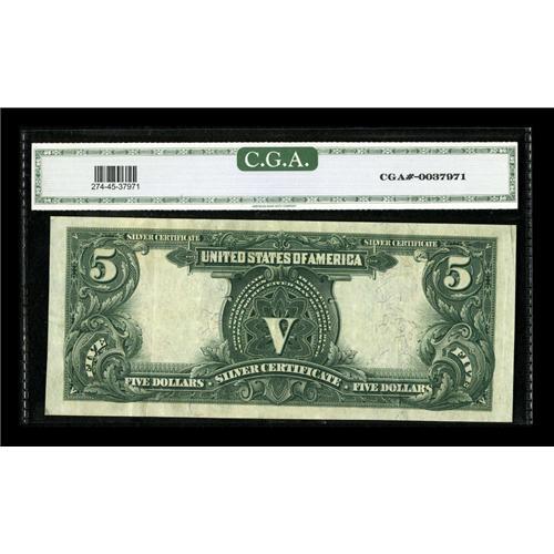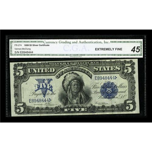 <B>Fr. 274 $5 1899 Silver Certificate CGA Extremely Fine 45.</B></I> Three folds are seen within the holder on this note's otherwise natural surfaces. This premium Chief is likely to see spirited bidding.<BR><BR><b>Shipping:</b> Coins & Currency (<a target="_blank" href="http://www.heritageauctions.com/common/shipping.php">view shipping information</a>)