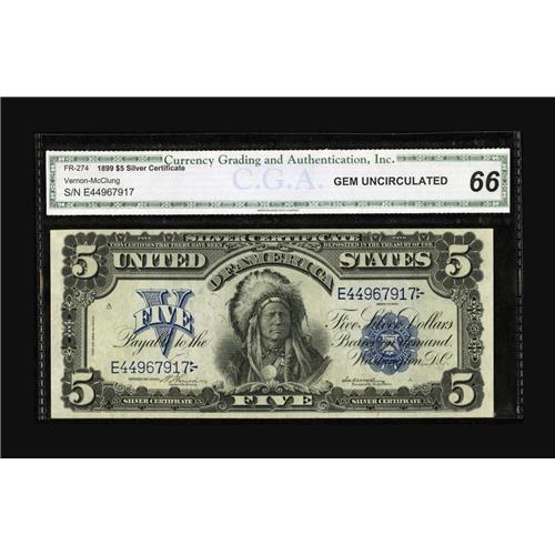 <B>Fr. 274 $5 1899 Silver Certificate CGA Gem Uncirculated 66.</B></I> Embossing and nice color are viewed through the third-party holder.<BR><BR><b>Shipping:</b> Coin/Currency (<a target="_blank" href="http://www.heritageauctions.com/common/shipping.php">view shipping information</a>)