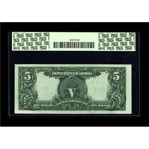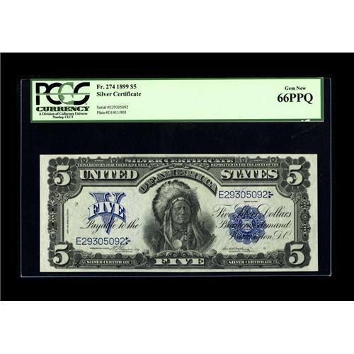 <B>Fr. 274 $5 1899 Silver Certificate PCGS Gem New 66PPQ.</B></I> In our opinion, the margins are perfectly even as is the front to back centering. We wonder then what is prohibiting this note from receiving a full Superb grade.<BR><BR><b>Shipping:</b> Coin/Currency (<a target="_blank" href="http://www.heritageauctions.com/common/shipping.php">view shipping information</a>)