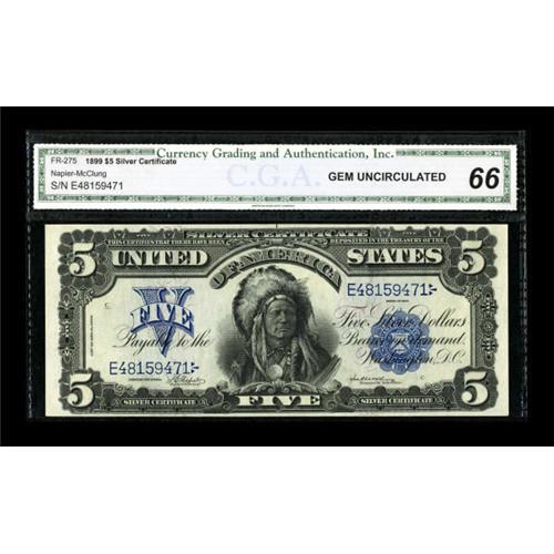 <B>Fr. 275 $5 1899 Silver Certificate CGA Gem Uncirculated 66.</B></I> Broad margins are noted on this bright issue. The overprint is ideal and the printed devices are bold.<BR><BR><b>Shipping:</b> Coins & Currency (<a target="_blank" href="http://www.heritageauctions.com/common/shipping.php">view shipping information</a>)