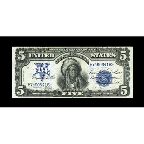 <B>Fr. 275 $5 1899 Silver Certificate Choice About New.</B></I> From our 2001 Texas Collection sale where the note was described, "A richly colored Chief note with a hint of staining along the top margin and light, but unmistakable quarter folds."