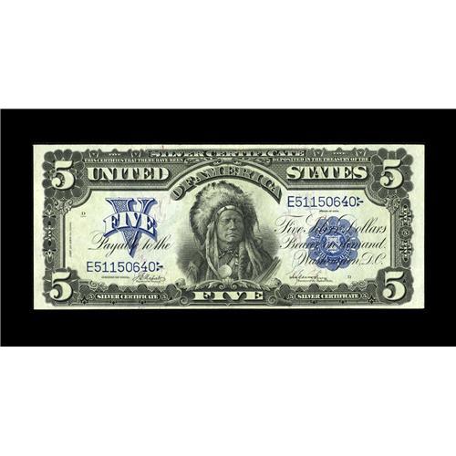 <B>Fr. 275 $5 1899 Silver Certificate Gem New.</B></I> This note which is an old friend was previously Lot 18534 in our FUN 2003 sale. The description read, "A lovely Chief, with broad margins and bright colors." Not much has changed since then.<BR><BR><b>Shipping:</b> Coin/Currency (<a target="_blank" href="http://www.heritageauctions.com/common/shipping.php">view shipping information</a>)