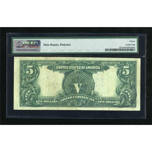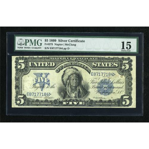 <B>Fr. 275 $5 1899 Silver Certificate PMG Choice Fine 15.</B></I> This Chief faces up well. The label reads, "hole repair, pinholes."<BR><BR><b>Shipping:</b> Coins & Currency (<a target="_blank" href="http://www.heritageauctions.com/common/shipping.php">view shipping information</a>)
