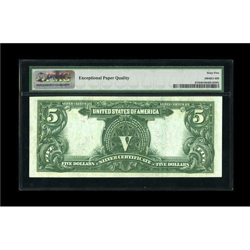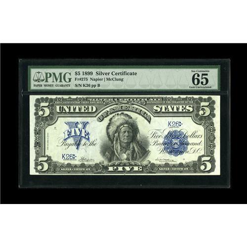 <B>Fr. 275 $5 1899 Silver Certificate PMG Gem Uncirculated 65 EPQ.</B></I> This two-digit Chief has garnered the coveted "Exceptional Paper Quality" comment from PMG. It certainly earned it, the deep original embossing is easily seen through the third party holder. Its a real beauty, sure to please its new owner.