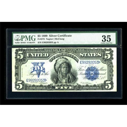 <B>Fr. 275 $5 1899 Silver Certificate PMG Choice Very Fine 35.</B></I> A brightly inked Chief in a high end Very Fine PMG holder. <BR><BR><b>Shipping:</b> Coins & Currency (<a target="_blank" href="http://www.heritageauctions.com/common/shipping.php">view shipping information</a>)