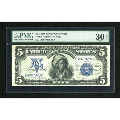 <B>Fr. 275 $5 1899 Silver Certificate PMG Very Fine 30 EPQ.</B></I> An attractive and wholly original Chief.<BR><BR><b>Shipping:</b> Coins & Currency (<a target="_blank" href="http://www.heritageauctions.com/common/shipping.php">view shipping information</a>)