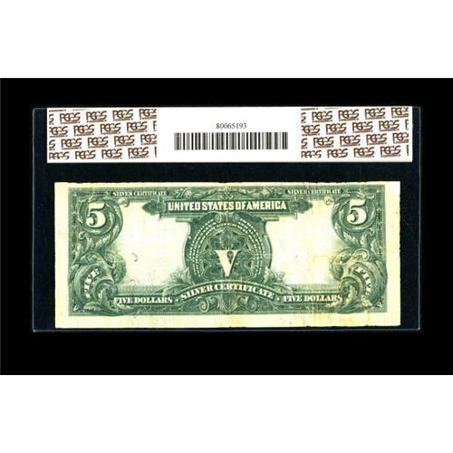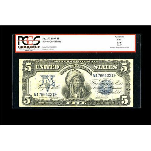 <B>Fr. 277 $5 1899 Silver Certificate PCGS Apparent Fine 12.</B></I> The third-party label notifies us of "washed; edge splits at left." Still this Chief is more attractive than many of its siblings. PCGS recently announced they will not be issuing any more notes in red label holders.<BR><BR><b>Shipping:</b> Coins & Currency (<a target="_blank" href="http://www.heritageauctions.com/common/shipping.php">view shipping information</a>)