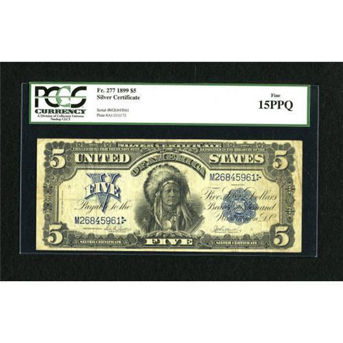 <B>Fr. 277 $5 1899 Silver Certificate PCGS Fine 15PPQ.</B></I> A pleasing Chief with lots of color and originality.<BR><BR><b>Shipping:</b> Coins & Currency (<a target="_blank" href="http://www.heritageauctions.com/common/shipping.php">view shipping information</a>)