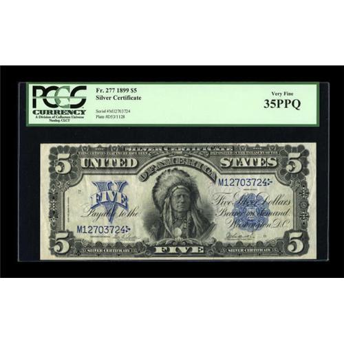 <B>Fr. 277 $5 1899 Silver Certificate PCGS Very Fine 35PPQ.</B></I> A wonderfully embossed original note with loads of eye appeal.<BR><BR><b>Shipping:</b> Coins & Currency (<a target="_blank" href="http://www.heritageauctions.com/common/shipping.php">view shipping information</a>)