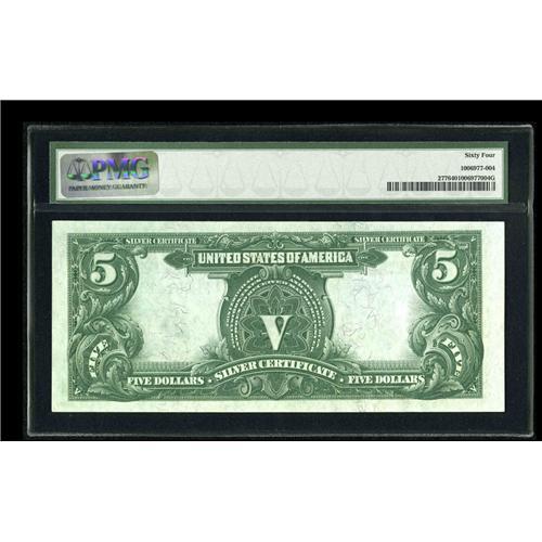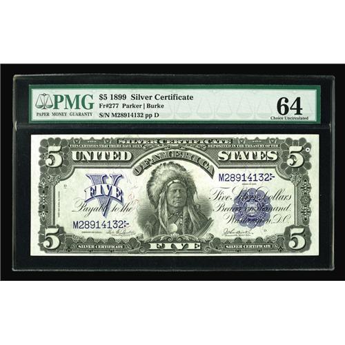 <B>Fr. 277 $5 1899 Silver Certificate PMG Choice Uncirculated 64.</B></I> This example has decent margins encompassing well inked and vibrant surfaces.