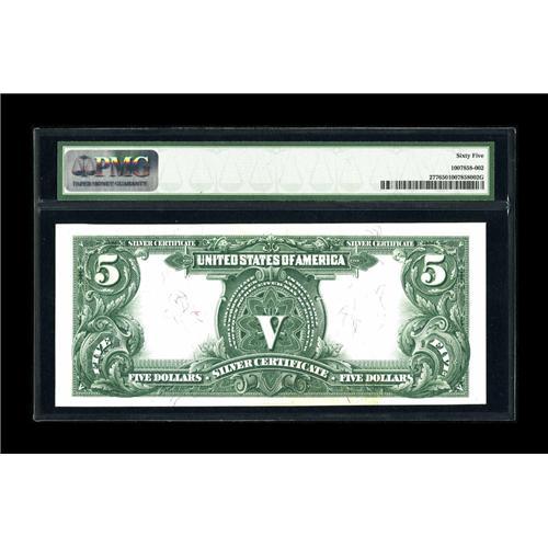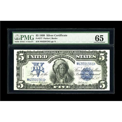 <B>Fr. 277 $5 1899 Silver Certificate PMG Gem Uncirculated 65.</B></I> A bit of handling is noticed at right, which precluded an EPQ modifier. The note does face up like a full Gem.<BR><BR><b>Shipping:</b> Coin/Currency (<a target="_blank" href="http://www.heritageauctions.com/common/shipping.php">view shipping information</a>)