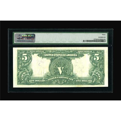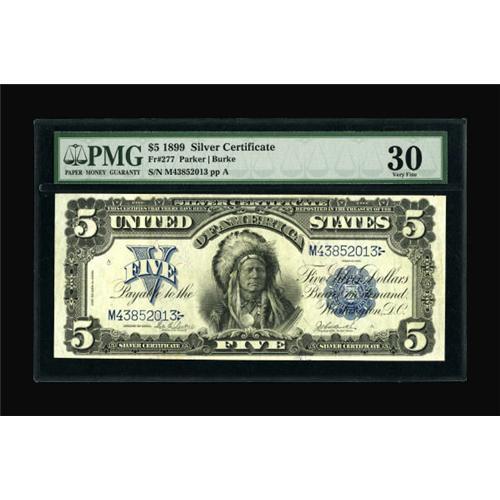 <B>Fr. 277 $5 1899 Silver Certificate PMG Very Fine 30.</B></I> For the grade, this piece boasts bright paper, a bold third printing, and bountiful margins.<BR><BR><b>Shipping:</b> Coins & Currency (<a target="_blank" href="http://www.heritageauctions.com/common/shipping.php">view shipping information</a>)