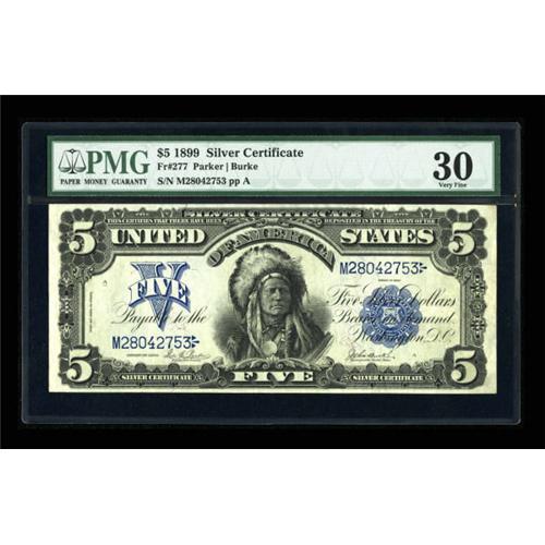 <B>Fr. 277 $5 1899 Silver Certificate PMG Very Fine 30.</B></I> This deeply printed Chief has all the eye appeal of a full EF or better note.<BR><BR><b>Shipping:</b> Coins & Currency (<a target="_blank" href="http://www.heritageauctions.com/common/shipping.php">view shipping information</a>)