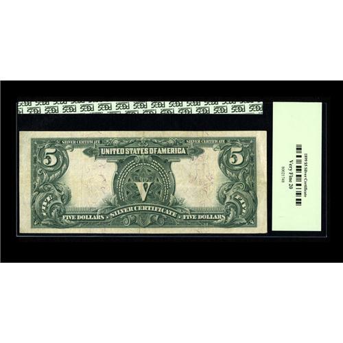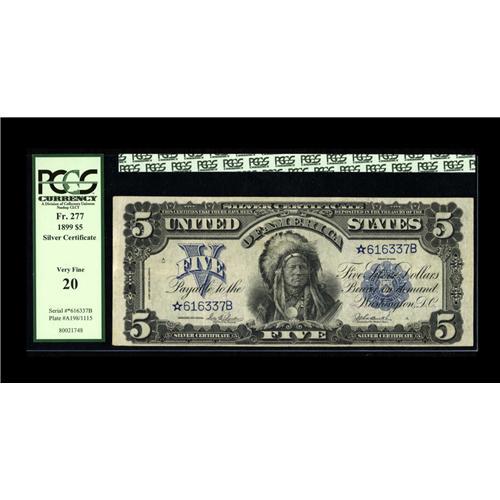 <B>Fr. 277 $5 1899 Silver Certificate Star Note PCGS Very Fine 20.</B></I> This is the first Rodeo for this note as it has not previously been offered at auction. Fortunately for collectors, Star Note values have been added to the Friedberg book, which should increase awareness and the popularity of the notes. This is a pleasing mid-grade example with much of its original color. To date only nine examples of this number are known, with only one appearance in the last half decade.<BR><BR><b>Shipping:</b> Coin/Currency (<a target="_blank" href="http://www.heritageauctions.com/common/shipping.php">view shipping information</a>)