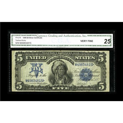 <B>Fr. 278 $5 1899 Silver Certificate CGA Very Fine 25.</B></I> This certified note appears to retain much of its original crispness.<BR><BR><b>Shipping:</b> Coin/Currency (<a target="_blank" href="http://www.heritageauctions.com/common/shipping.php">view shipping information</a>)