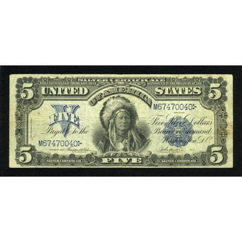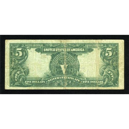 <B>Fr. 278 $5 1899 Silver Certificate Fine.</B></I> Friedberg 278s have the face plate number in two different positions. The first variety displays the plate number directly below the right-hand plate letter, while the second variety has the plate number to the immediate right of the right-hand plate letter. This Chief is of the second variety.<BR><BR><b>Shipping:</b> Coins & Currency (<a target="_blank" href="http://www.heritageauctions.com/common/shipping.php">view shipping information</a>)