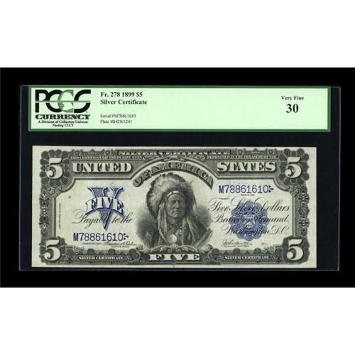 <B>Fr. 278 $5 1899 Silver Certificate PCGS Very Fine 30.</B></I> A moderately circulated issue with a bold overprint and white paper.<BR><BR><b>Shipping:</b> Coins & Currency (<a target="_blank" href="http://www.heritageauctions.com/common/shipping.php">view shipping information</a>)