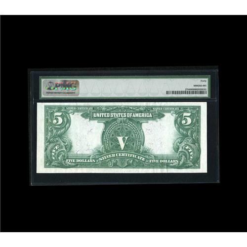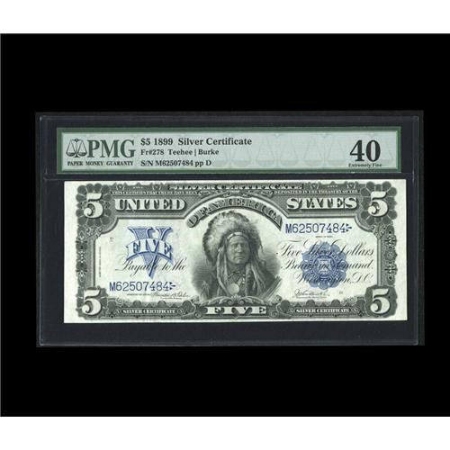 <B>Fr. 278 $5 1899 Silver Certificate PMG Extremely Fine 40.</B></I> Though the note has a few folds that account for the grade, the soil-free surfaces are evidence that this piece spent minimal time in channels of commerce.