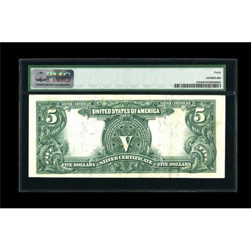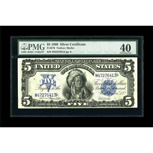<B>Fr. 278 $5 1899 Silver Certificate PMG Extremely Fine 40.</B></I> A couple of pinholes in the corners of the margin may have eliminated the EPQ designation from this note. The color is wonderful and the embossing looks as it did the day the note was printed.<BR><BR><b>Shipping:</b> Coins & Currency (<a target="_blank" href="http://www.heritageauctions.com/common/shipping.php">view shipping information</a>)