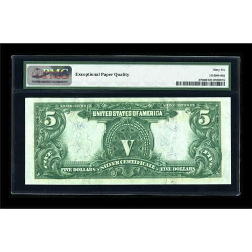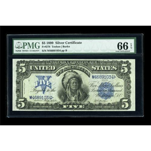 <B>Fr. 278 $5 1899 Silver Certificate PMG Gem Uncirculated 66 EPQ.</B></I> A beautifully centered example with embossing so bold it almost comes right through the PMG 66 EPQ holder. PMG has graded five Fr. 278's in this grade, with only one finer. We sold a virtually identical PMG 66 EPQ example just five serial numbers away from this piece in May of this year for $11,500, and it would not surprise us at all to see this lovely note equal or exceed that number tonight. <BR><BR><b>Shipping:</b> Coins & Currency (<a target="_blank" href="http://www.heritageauctions.com/common/shipping.php">view shipping information</a>)