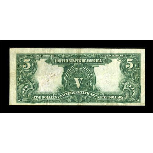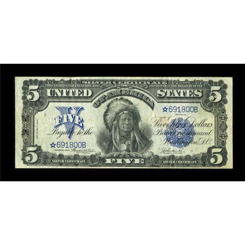 <B>Fr. 278 $5 1899 Silver Certificate Star Note Fine+.</B></I> This is a more than acceptable example of the very rare Face Plate Type 1 star. This variety displays the plate number below the plate letter, while the Type 2 has the plate number to the right of the plate letter. A small repair is noticed near the blue seal.<BR><BR><b>Shipping:</b> Coins & Currency (<a target="_blank" href="http://www.heritageauctions.com/common/shipping.php">view shipping information</a>)